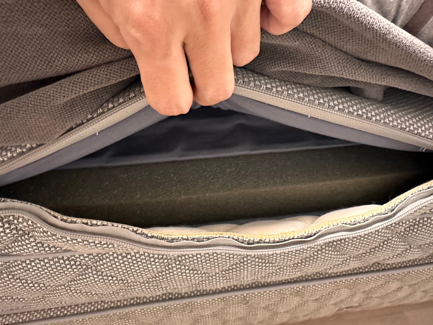 아래와 같이 스프링 미들레이어 위에 지퍼를 열어서 스피링 위치를 변경하여 컴포트 존을 바꿀 수 있습니다.